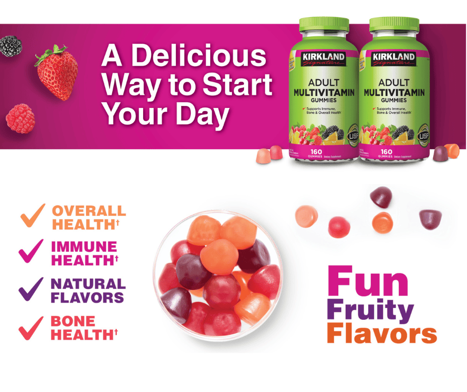 Vitamin đóng một vai trò là chất xúc tác trong các phản ứng sinh hóa, từ quá trình trao đổi chất, đến việc xây dựng hệ thống miễn dịch trong cơ thể. Vitamin có vai trò đặc biệt quan trọng trong quá trình sản sinh năng lượng, duy trì các hoạt động sống của cơ thể. Mỗi loại vi chất có những lợi ích riêng và đều được chứa trong nguồn thực phẩm hàng ngày. Vitamin giúp chuyển hóa tối đa các chất dinh dưỡng thành năng lượng sống cho cơ thể chúng ta, tăng cường sức đề kháng và bảo vệ cơ thể. Với chế độ dinh dưỡng mỗi ngày, sẽ không đáp ứng đủ hàm lượng vitamin cho cơ thể, đặc biệt là người lớn khá bận rộn không có nhiều thời gian. Kirkland Signature Adult Multivitamin Gummies là một cách ngon miệng để hỗ trợ sức khỏe tổng thể của bạn. Chỉ cần hai viên kẹo cao su ngon mỗi ngày sẽ cung cấp một nguồn tuyệt vời gồm 10 loại vitamin thiết yếu. Với hương vị trái cây vui nhộn như quả mọng hỗn hợp, trái cây nhiệt đới và dâu tây, bạn có thể say mê khi biết những loại kẹo dẻo này hỗ trợ các cấu trúc và chức năng quan trọng của cơ thể.