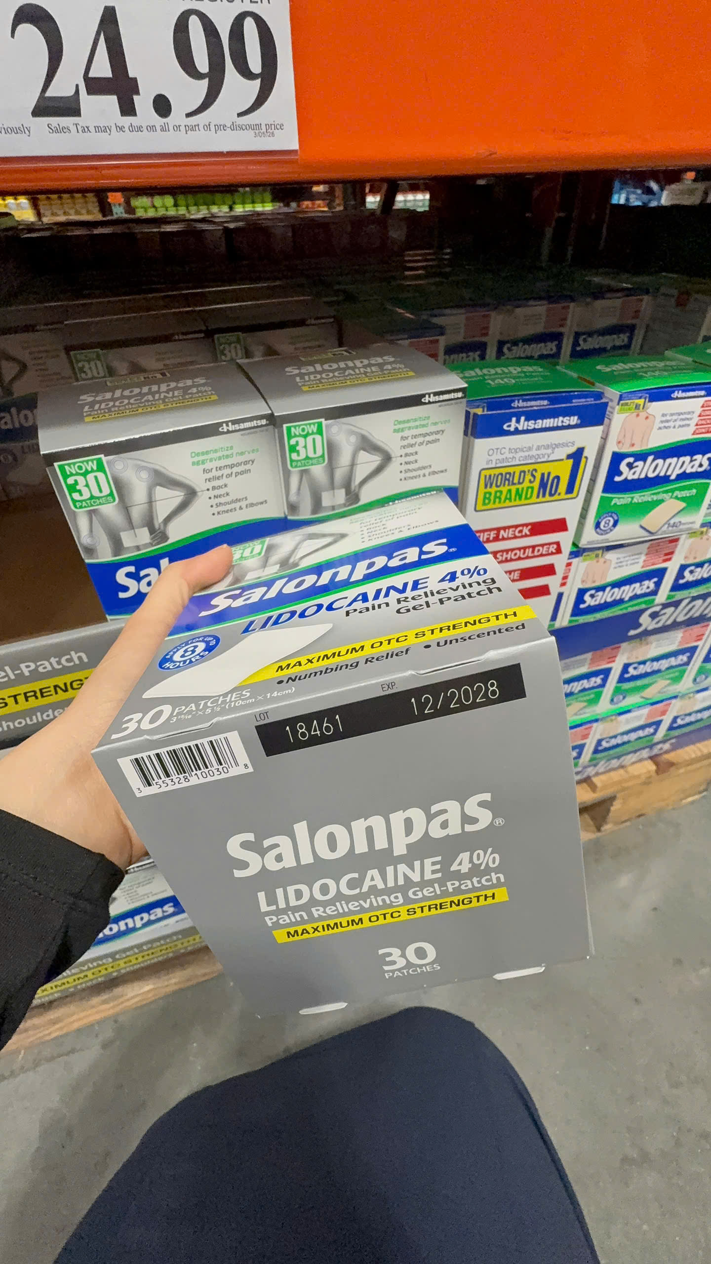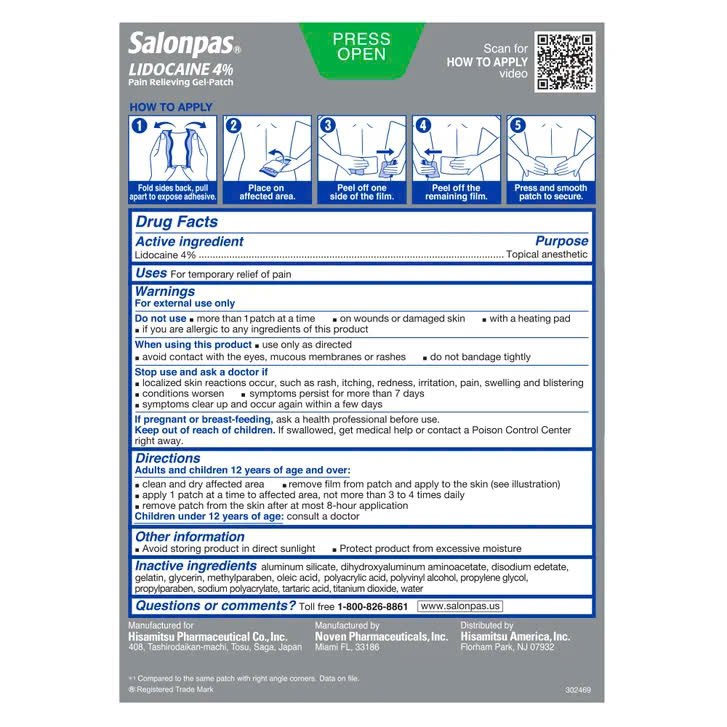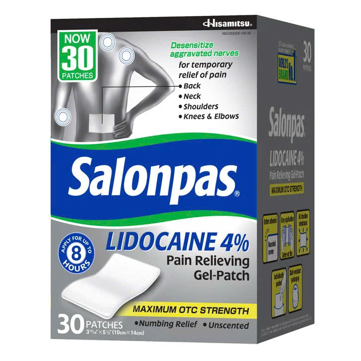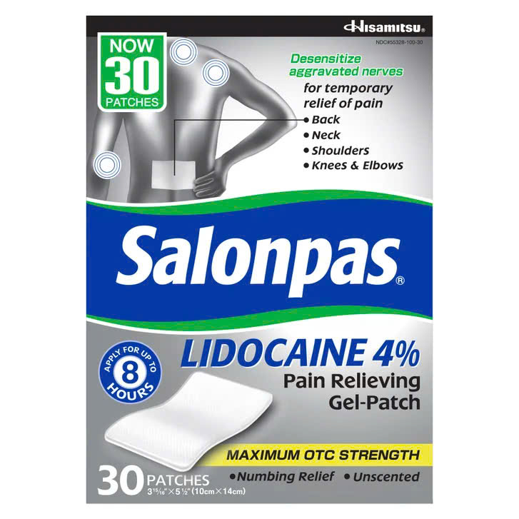 Salonpas LIDOCAINE Pain Relieving Gel-Patch sử dụng công nghệ gel hydro và Lidocain cường độ tối đa có sẵn mà không cần kê đơn để giảm đau. Miếng dán giảm đau Salonpas LIDOCAINE giúp giảm đau tạm thời ở lưng, cổ, vai, đầu gối và khuỷu tay. Xin lưu ý rằng Salonpas LIDOCAINE Pain Relieving Gel-Patch không được chỉ định cho chứng đau dây thần kinh sau herpetic.