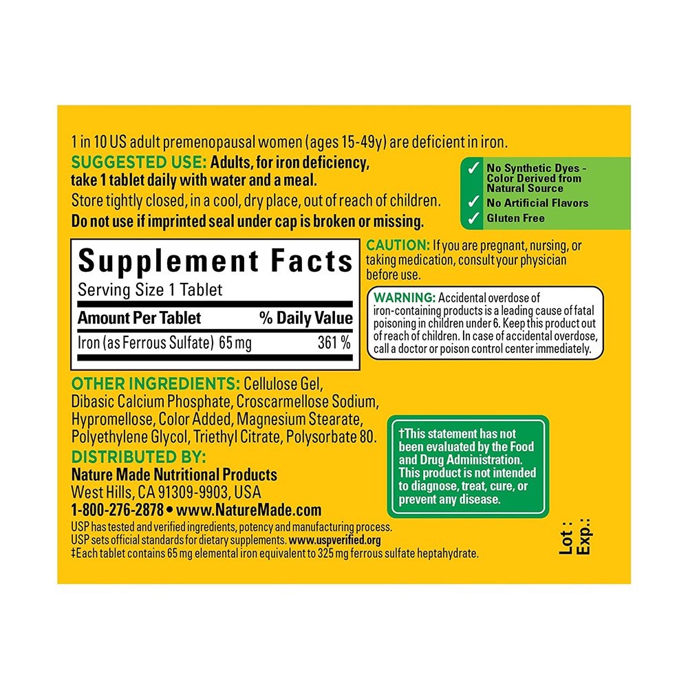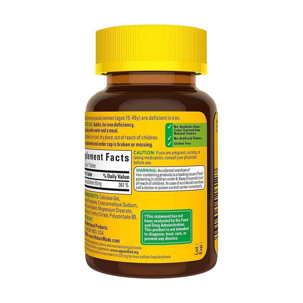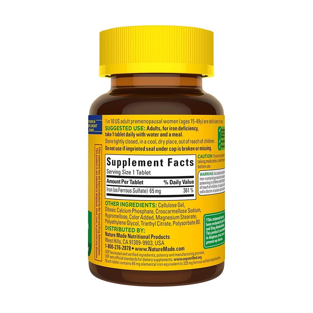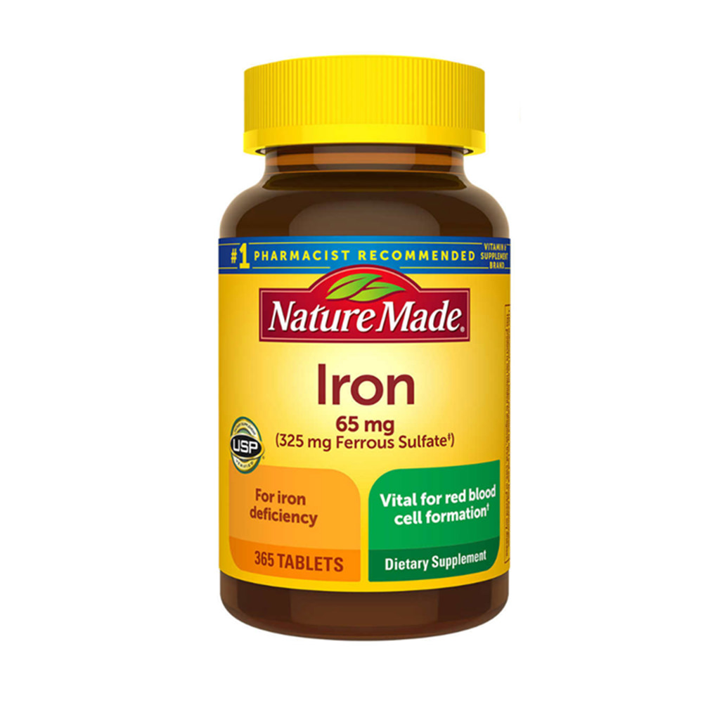 Viên bổ sung sắt Nature Made Iron 65mg 365 viên của Mỹ cung cấp 65 mg sắt để giúp những người thiếu sắt đáp ứng nhu cầu dinh dưỡng của họ. Sắt là một phần thiết yếu của hemoglobin, một chất protein giúp các tế bào hồng cầu vận chuyển oxy đi khắp cơ thể. Sản phẩm được chứng nhận USP về chất lượng và đã được đánh giá rất cao trên Amazon.