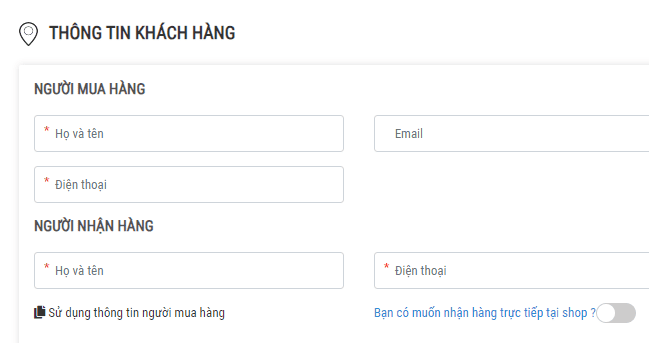 - Đối với khách hàng mua mới không muốn đăng ký tài khoản: Quý khách nhập thông tin người mua chi tiết, nếu thông tin người nhận trùng với thông tin người mua chỉ cần click vào nút " sử dụng thông tin người mua hàng" là dữ liệu tự copy qua. Nếu thông tin người nhận khác người mua, Quý khách điền thêm vào.