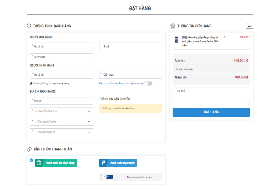 Trên trang thanh toán, khách hàng lưu ý điền đầy đủ thông tin bắt buộc cho đơn hàng: