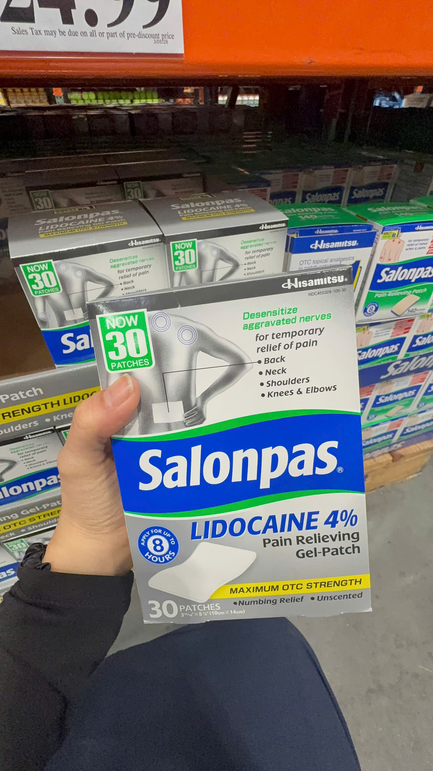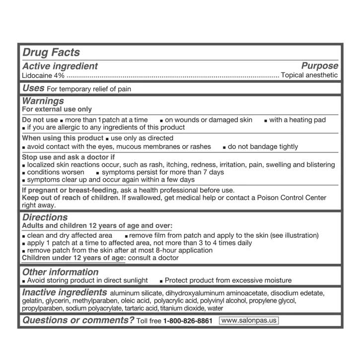 Salonpas LIDOCAINE Pain Relieving Gel-Patch sử dụng công nghệ gel hydro và Lidocain cường độ tối đa có sẵn mà không cần kê đơn để giảm đau. Miếng dán giảm đau Salonpas LIDOCAINE giúp giảm đau tạm thời ở lưng, cổ, vai, đầu gối và khuỷu tay. Xin lưu ý rằng Salonpas LIDOCAINE Pain Relieving Gel-Patch không được chỉ định cho chứng đau dây thần kinh sau herpetic.
