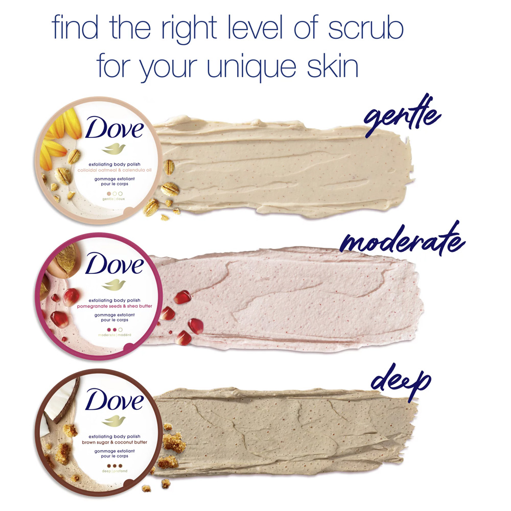 Tẩy tế bào chết Dove Exfoliating Body Polish 298g với kết cấu kem mịn và dưỡng ẩm sâu không những giúp cơ thể loại bỏ tế bào chết mà còn giúp dưỡng da mịn màng và tươi sáng. Dove Exfoliating Body Polish 298g không tổn hại da khi massage nhưng lại dễ dàng thấm vào da. Thành phần tự nhiên giúp làm sạch da và nuôi dưỡng sâu, khôi phục làn da sáng hồng da mỗi ngày.