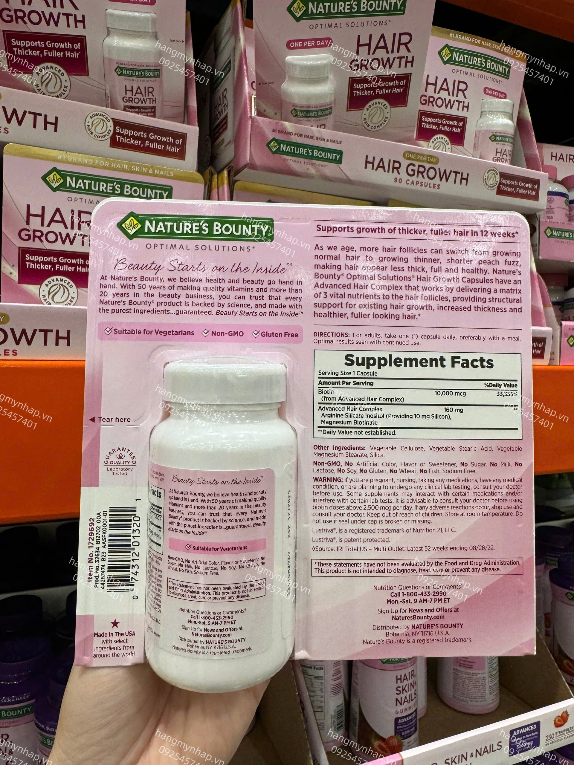 Nature's Bounty Optimal Solutions Hair Growth - Viên uống bổ sung tăng trưởng tóc Nature's Bounty với phức hợp tóc nâng cao hoạt động, cung cấp các chất dinh dưỡng quan trọng như biotin, silicon và arginine đến các nang tóc và kích thích sự phát triển của tóc, giúp tóc mọc dày và đầy đặn hơn.