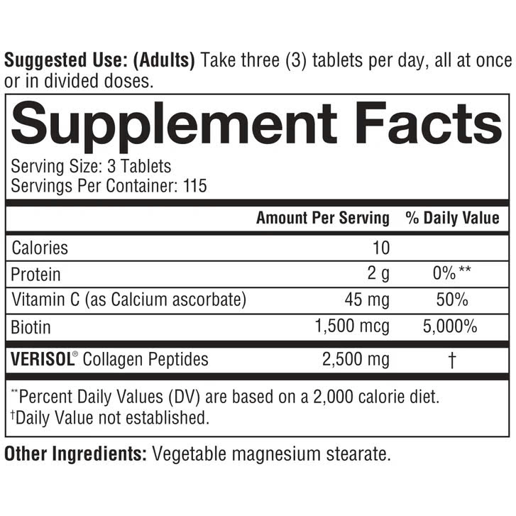 Verisol Collagen Peptide 2.500mg: Hàm lượng tiêu chuẩn - được nghiên cứu nhiều nhất - và đã có những thử nghiệm cho thấy với 2.500mg collagen peptide mỗi ngày, hiệu quả sẽ rõ rệt sau vài tháng.